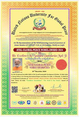 Hon’ble Prime Minister Of India Shri Narendra Modi Jii is Honoured with ” ATAL GLOBAL PEACE NOBEL AWARD 2024″  from His Eminence Prof. Dr. Madhu Krishan , The Eminent Scientist , Chairman cum Chief Rector of The UNITED NATIONS UNIVERSITY FOR GLOBAL PEACE USA , as a tribute to Hon’ble late Atal Bihari Vajpayee ji  on his Birthday Jayanthi in a befitting event at Jammu , India .